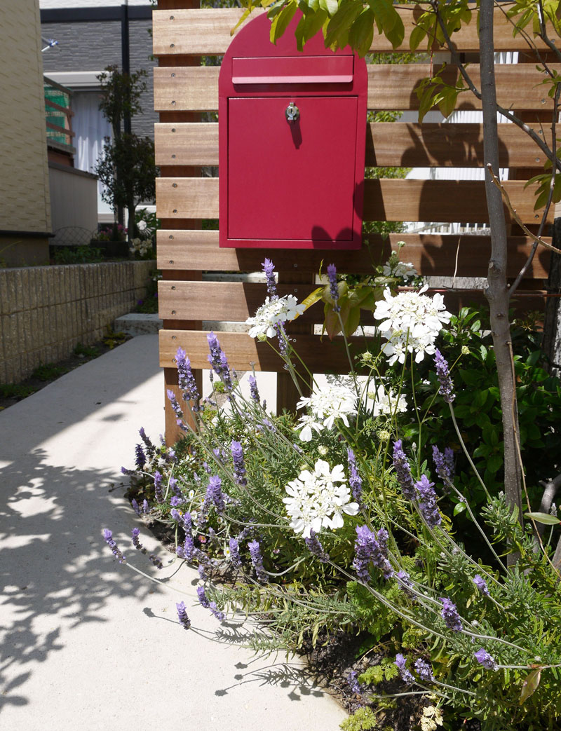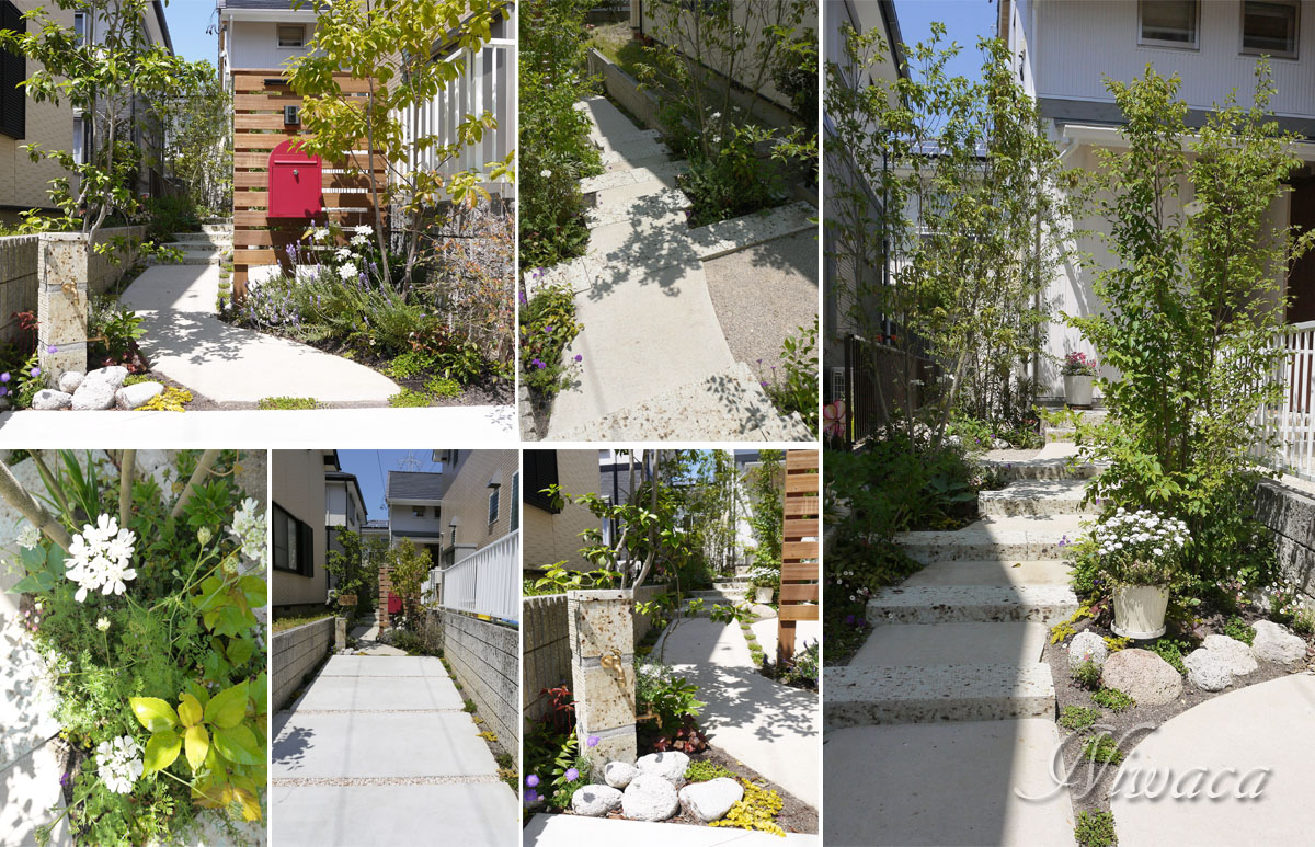 緑のトンネルのアプローチ 100年以上の歴史を持つ株式会社 平松組、 シンプルハウスさんのモデルハウスの外構です。 細長い旗竿地をうまく生かして、緑のトンネルを くぐって歩いていくようなアプローチを計画しました。 アプローチと玄関ポーチは、やわらかい雰囲気の 美和土仕上げと大谷石と枕木を組み合わせ、 やさしい雰囲気の建物ともぴったり合う 外構になりました。