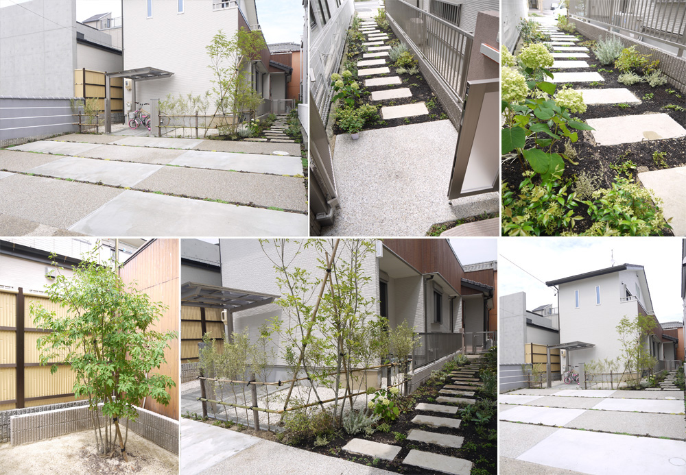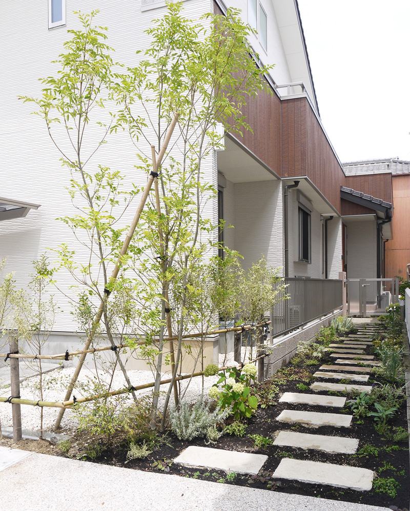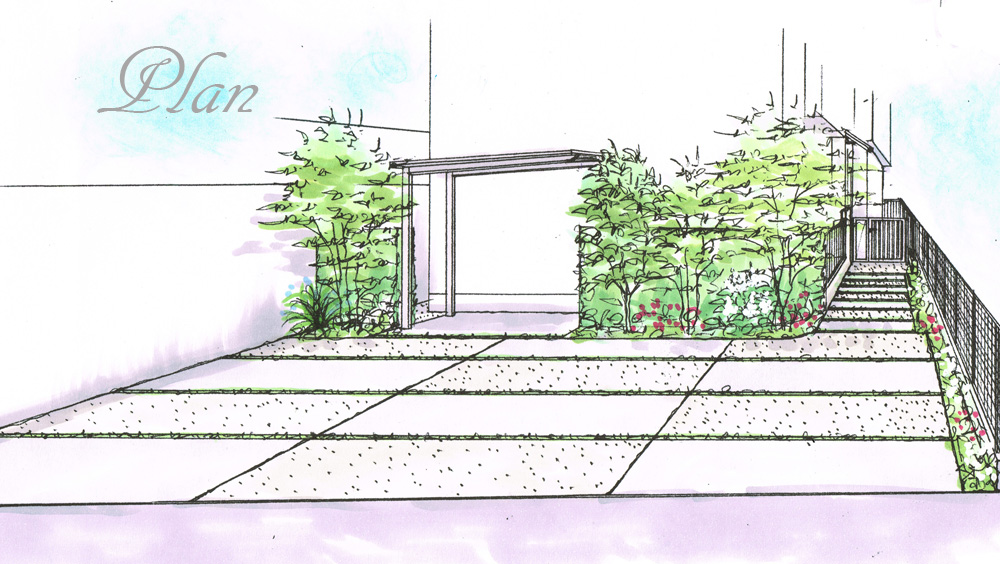 市松模様と緑の小道 駐車場の部分に市松模様でデザインをつけ、 アプローチは緑の間を歩ける小道のようにすることで、 緑の分量を多くしています。 アプローチは日が当たりにくい日陰なので、 明るい葉色の植栽で明るい雰囲気にしています。 自転車置き場は、引き戸と生垣で仕切って、固くなりすぎないように。 制約の多い中、それを生かしたデザインにする ことで、 町並みにも緑を提供する素敵な 外構になりました。