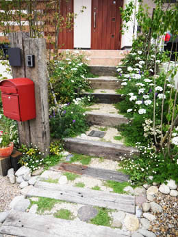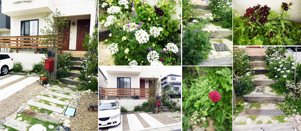 自然の小道 枕木を使ったナチュラルなアプローチにしたい。 そんなN様のご希望を受けて、自然の小道を歩くようなアプローチをご提案。 アプローチ部分は、あえて舗装はせずに土を残し て、踏圧に強いグランドカバーのリピアを植栽し、 花と緑のあふれる自然の小道のようなアプローチ になりました。