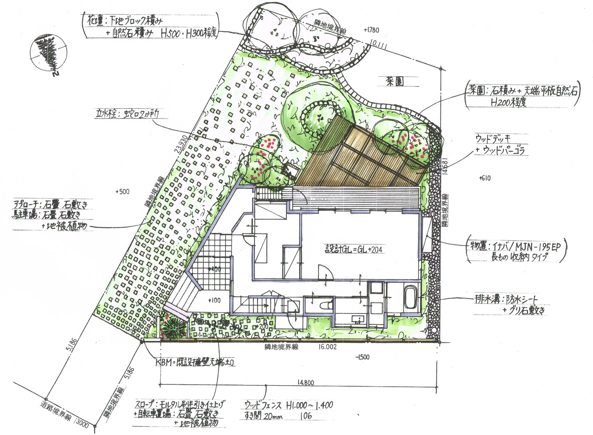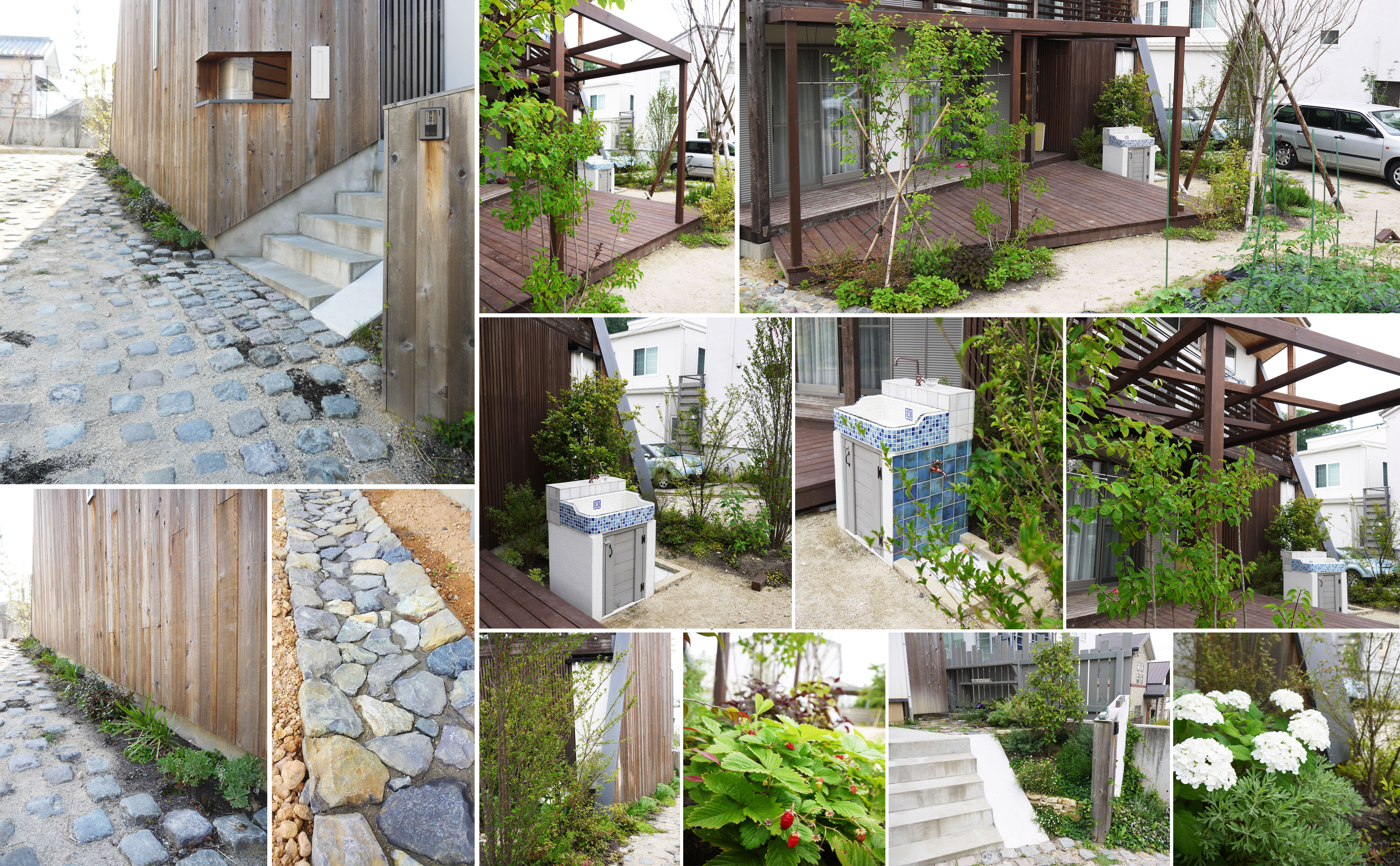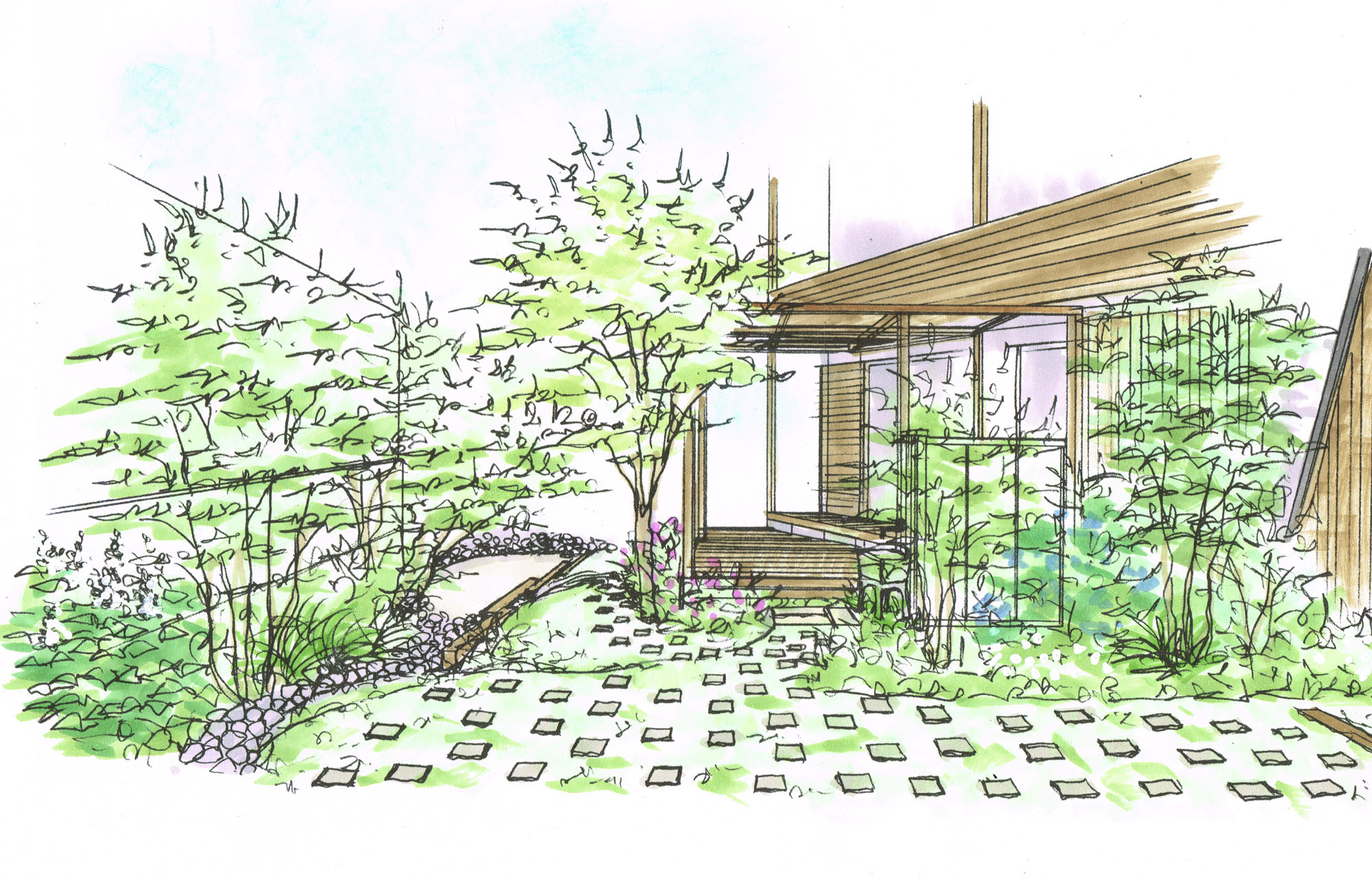 庭に続く石畳の駐車場を抜けると、シンボルのサルスベリが木陰をつくる広いウッドデッキを設け、のびのびとお庭時間を楽しめるスペースに。